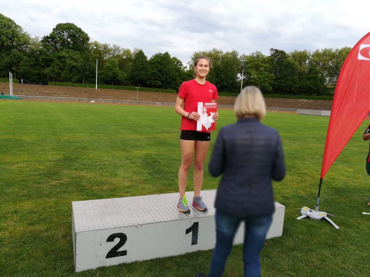 Einen weiteren Treppchenplatz in Gladbeck erzielte Maja Gonschorek (2002). Im Weitsprung kratzte sie mit 4,61m an ihrer Bestmarke und sicherte sich damit den dritten Platz in der Altersgruppe WJB. Im Sperrwurf belegte Maja mit einer Weite von 22,06m den sechsten Platz und sicherte sich damit gleichzeitig den Kreismeistertitel im Sperrwurf.